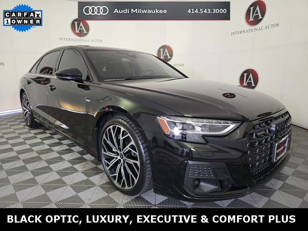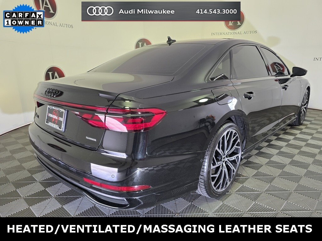 CARFAX One-Owner. Clean CARFAX. Mythos Black Metallic 2023 Audi A8 L 55 quattro quattro 8-Speed Automatic with Tiptronic 3.0L V6 Turbocharged DOHC 24V LEV3-ULEV70 335hp Black w/Valetta Leather Seat Upholstery or Valcona Leather Seat Upholstery, 17 Speakers, 22-Way Heated Multi-Contour Comfort Front Seats, Alloy wheels, Alu-Optic Buttons, Audi Adaptive Cruise Assist w/Lane Guidance, Audi Black Rings & Badges, Audi Side Assist, Audi smartphone interface (Apple CarPlay/Android Auto), Auto High-beam Headlights, Auto tilt-away steering wheel, Auto-dimming door mirrors, Automatic temperature control, Bang & Olufsen Premium Sound System w/3D Sound, Black Optic Package, Comfort Plus Package, Contour/Ambient LED Interior Lighting Package, Dual-Pane Acoustic Glass for Side Windows, Dynamic All-Wheel-Steering, Executive Package, Extended Leather Package, Front Seat Massage Function, HD Matrix-Design LED Headlights, Head-Up Display, Heated Front Seat Armrests, Heated Rear Outboard Seats, Heated Rear Seat Armrests, Heated Steering Wheel, Intersection Assist, Leather steering wheel, Luxury Package, Memory seat, Navigation system: MMI Navigation plus, Outside temperature display, Power 2nd-Row Moonroof, Power moonroof, Pwr Rr Outboard Seats w/Lumbar & Memory Functions, Rain sensing wipers, Rear Matrix LED Reading Lights, Rear Outboard Seat Ventilation w/Massage, Rear Seat Remote Control, Rear Window Blind, Remote Park Assist Plus, Security system, Traffic Sign Recognition, Valcona Leather Seat Upholstery, Wheels: 21" 10-Y-Spoke-Evo-Design.