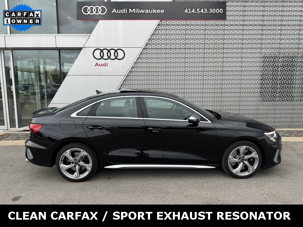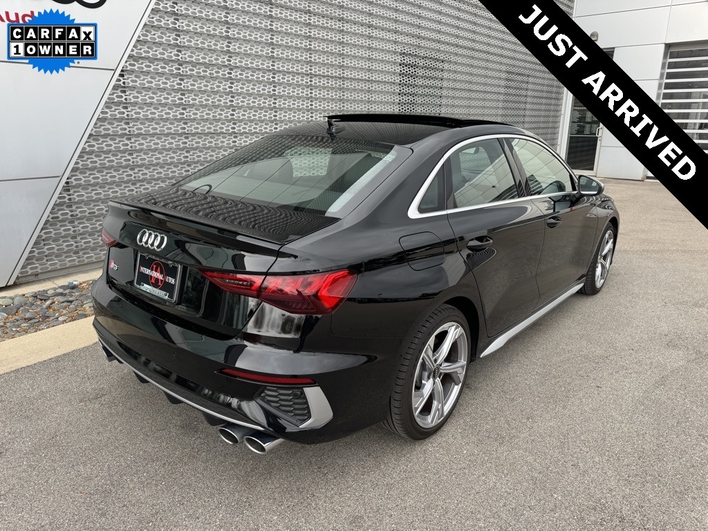 CARFAX One-Owner. Clean CARFAX. Mythos Black Metallic 2023 Audi S3 2.0T Premium quattro quattro 7-Speed Automatic S tronic 2.0L 4-Cylinder TFSI 6 Speakers, ABS brakes, Alloy wheels, Auto High-beam Headlights, Automatic temperature control, Compass, Dual front impact airbags, Exterior Parking Camera Rear, Fully automatic headlights, Headlight cleaning, Heated Front Sport Seats, Illuminated entry, Leather Seating Surfaces, Leather steering wheel, Outside temperature display, Panic alarm, Power driver seat, Power moonroof, Radio: Audi Sound System, Rain sensing wipers, Speed control, Sport Exhaust Resonator, Telescoping steering wheel, Tilt steering wheel, Wheels: 18" 5-Arm-Flag Design.